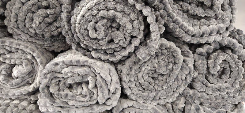 Мягкие пушистые серые коврики, сложенные в мотки и жгуты. Ассортимент светло-серых покрывал на полке магазина. Одеяла красиво разложены для продажи. Синтетическая ворсистая ткань