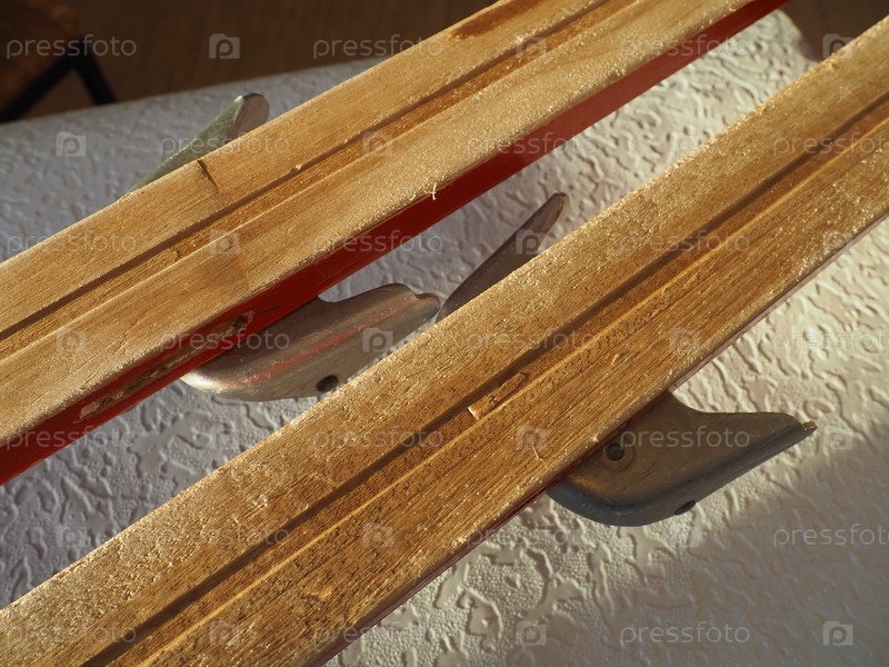 Деревянные лыжные носки, одна пара. Нижняя или внутренняя поверхность лыж обработана лыжным воском для улучшения скольжения по снегу и корке. Подготовка спортивного инвентаря к соревнованиям. Металлические жесткие крепления багажника