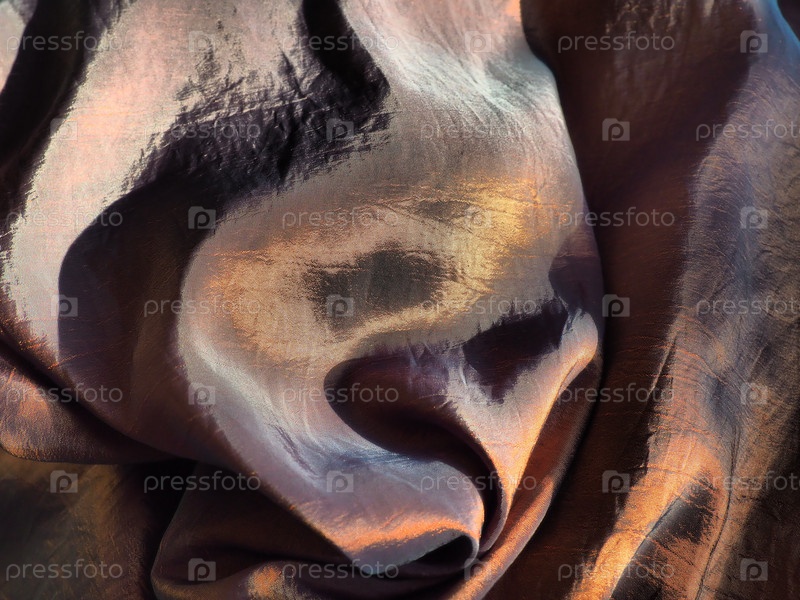 Красивая ткань - тафта, аккуратно сложенная волнами. Мятый материал, похожий на шелк или парчу. Перелив и цветовой градиент при разных углах освещения. Ткань для пошива одежды и штор