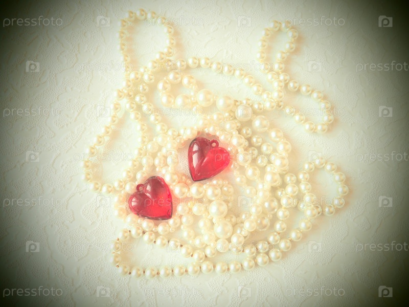 Валентинские сердечки. Красные пластиковые прозрачные сердечки. Жемчужные бусины. Поздравительная открытка с белым фоном к празднику Дня святого Валентина. Выражение любви. Копирование пространства. Плоская планировка. Рифленый фон
