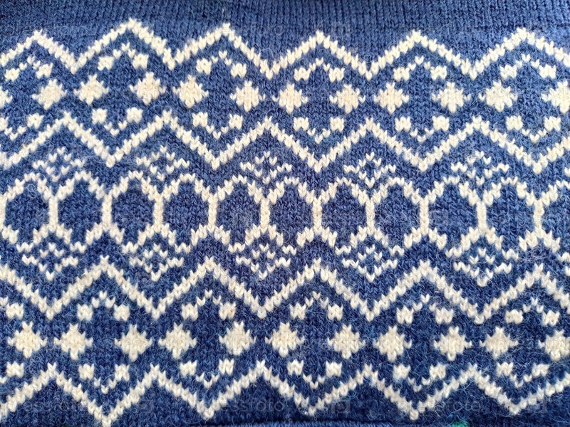 Фрагмент орнамента на вязаном полиэстеровом или шерстяном свитере. Зимние мотивы. Синие нитки для ручного вязания. Вязаный узор из белой нити. Ромбы, ломаные линии, волны и круги