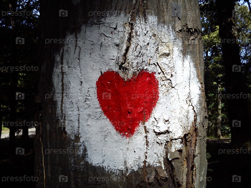 Нарисованные ярко-красные сердца на белом фоне на коре старого дерева. Обозначения для спортсменов, велосипедистов, скаутов и туристов. Фрушка-Гора в Сербии, недалеко от Сремска-Митровицы и Нови-Сада