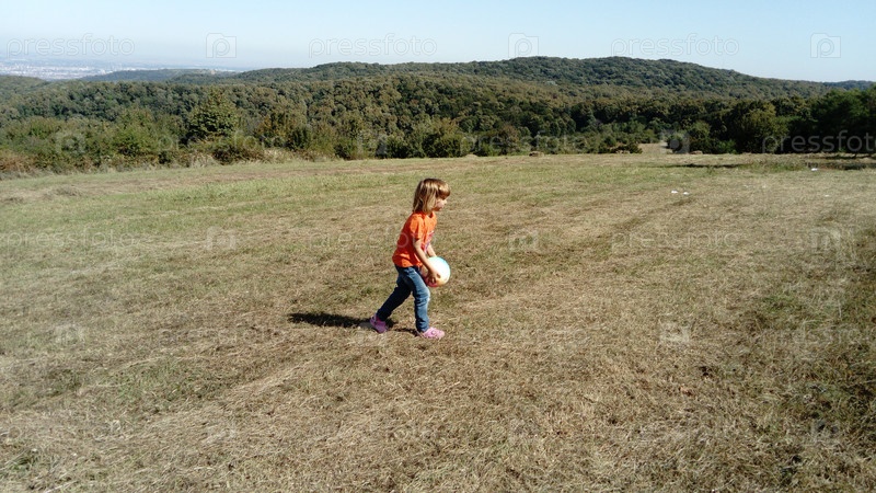 Девушка со светлыми волосами, одетая в оранжевую футболку и классические джинсы, играет с мячом на горном лугу. Ранняя теплая осень. На заднем плане пейзаж с вершины горы