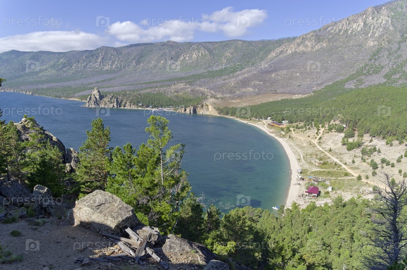 Вид с Большого Колокольного мыса на бухту Песчаная. Большая Байкальская тропа. Озеро Байкал. Иркутская область, Россия. Август