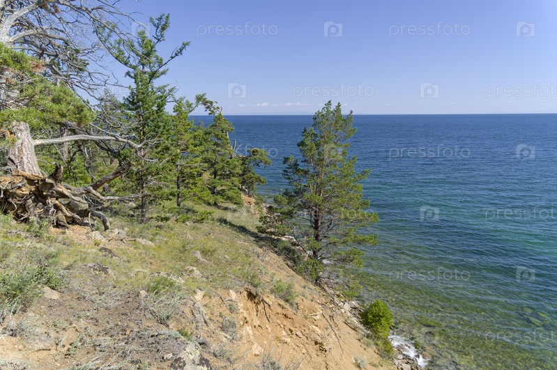 Поросший соснами гористый берег.Вид с Большой Байкальской тропы. Озеро Байкал. Иркутская область, Россия. Август
