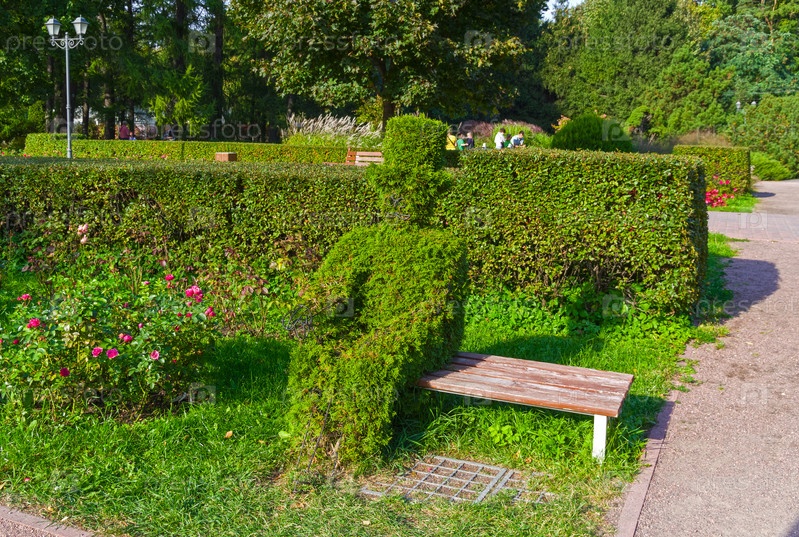 Оригинальная садовая скульптура - резултат фигурной обрезки деревьев. Дженьельмен в цилиндре сидит на лавочке. Большой розарий в парке Сокольники, Москва, Россия. Солнечный день во второй половине сентября