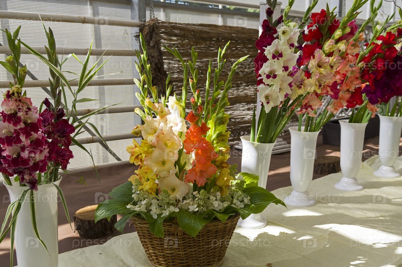 Букеты из красивых разноцветных гладиолусов. Выставка гладиолусов в оранжерее Аптекарского Огорода (филиал ботанического сада МГУ). Москва