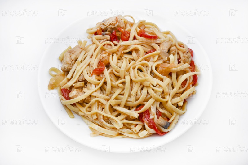 Корейская лапша Удон с мясом на белой тарелке. Вкусный пряный мясной завтрак