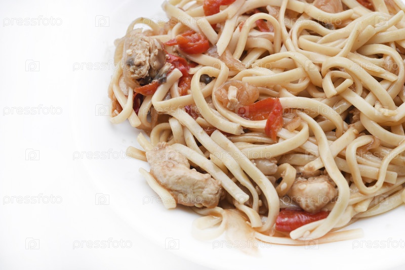 Корейская лапша Удон с мясом на белой тарелке. Вкусный пряный мясной завтрак