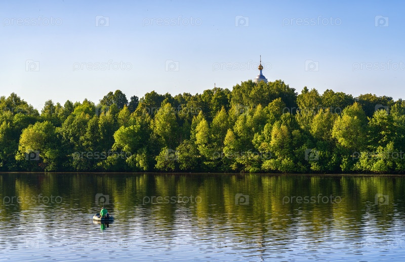 Рыбак на надувной резиновой лодке ловит рыбу напротив заросшего деревьями острова, над которым возвышается купол Русской православной церкви