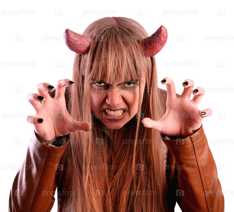 Девушка пугает под видом дьявола. Изолированные на белом фоне