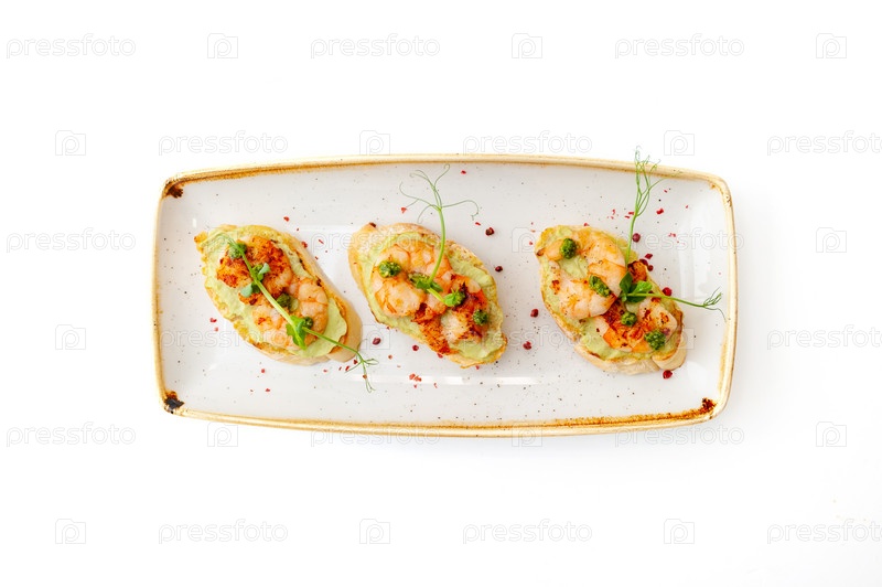 Брускетта с креветками на тосте из чиабатты с изолированным авокадо