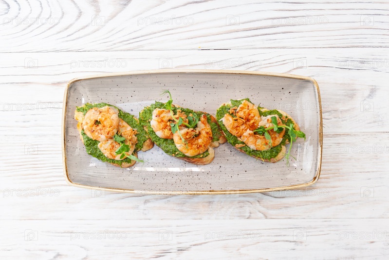 Брускетта с креветками на тосте из чиабатты с кремом из авокадо