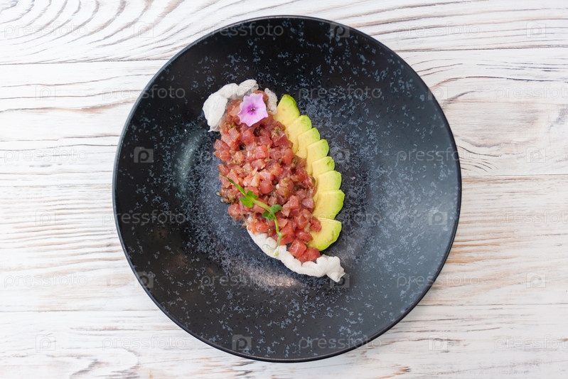 Тартар из тунца с авокадо на черной тарелке на светлом деревянном фоне