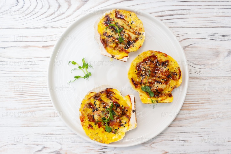 Гребешок в ракушках, запеченный в сливочном соусе с кунжутом