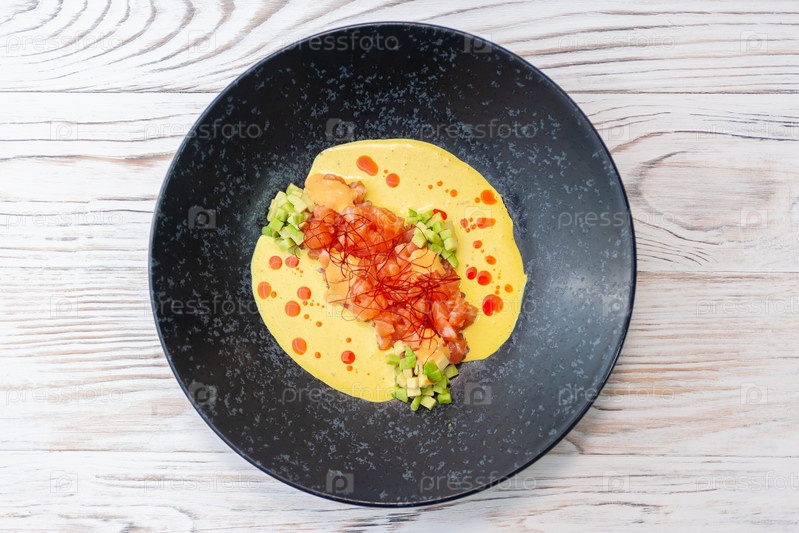 Тартар из лосося с авокадо, большим количеством соуса и нитями чили на черной тарелке