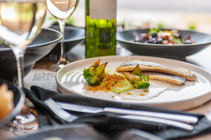 Дорадо или филе морского окуня в сливочном соусе с брокколи на изолированной белой тарелке