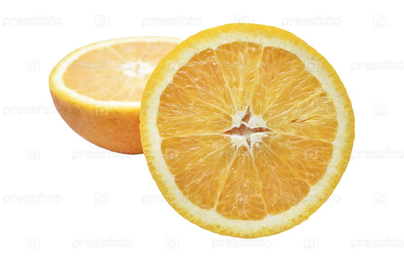 Ломтики апельсина на белом фоне. Изолированный объект желто-оранжевого цвета. Цитрусовые