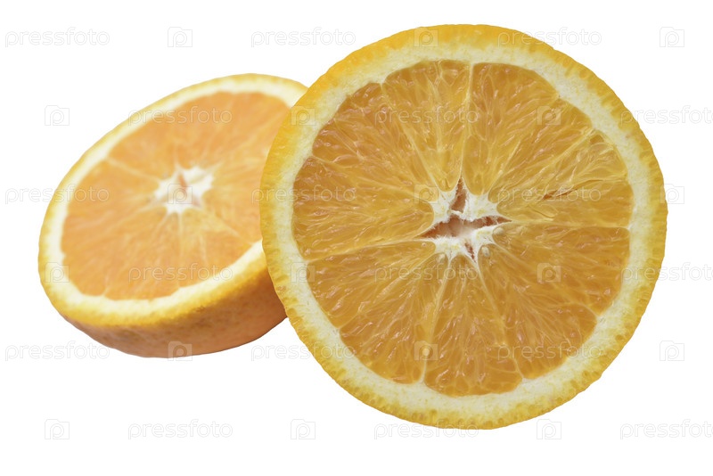 Ломтики апельсина на белом фоне. Изолированный объект желто-оранжевого цвета. Цитрусовые