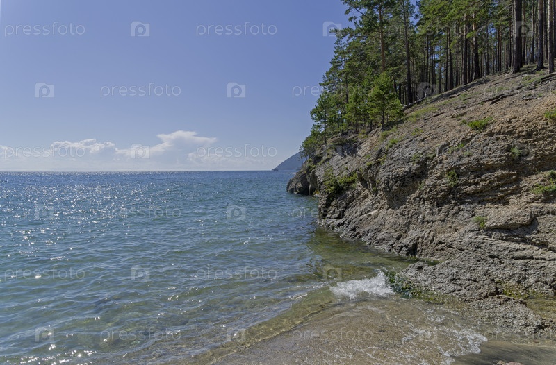 Высокий скалистый берег, поросший хвойным лесом. Вид с Большой Байкальской тропы. Озеро Байкал. Иркутская область, Россия. Август
