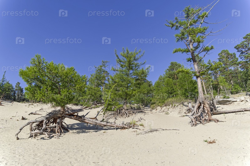 Памятник природы - ходульные деревья. Результат выветривания почвы. Бухта Песчаная, Большая Байкальская тропа. Озеро Байкал. Иркутская область, Россия. Август
