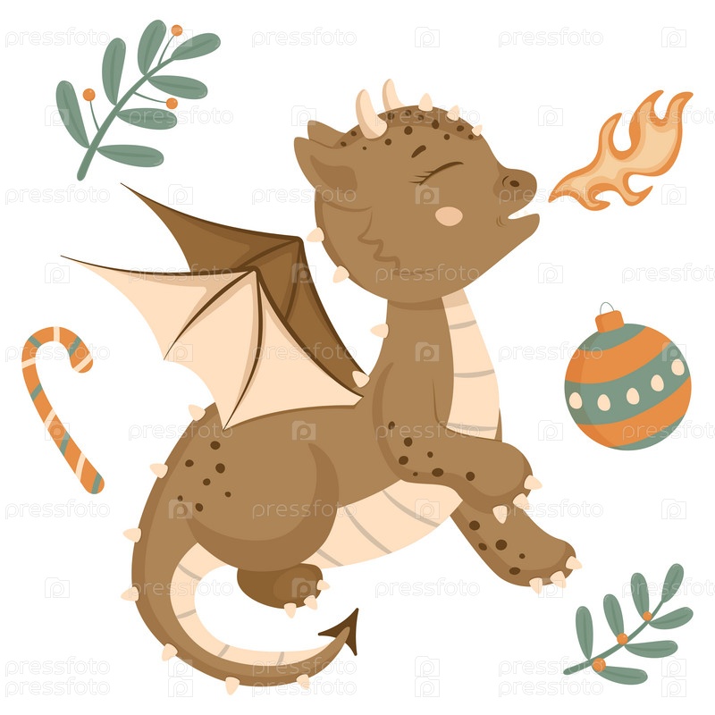 Новогодний набор в мультяшном стиле. Милый дракон, елочный шар, растение, леденец на палочке