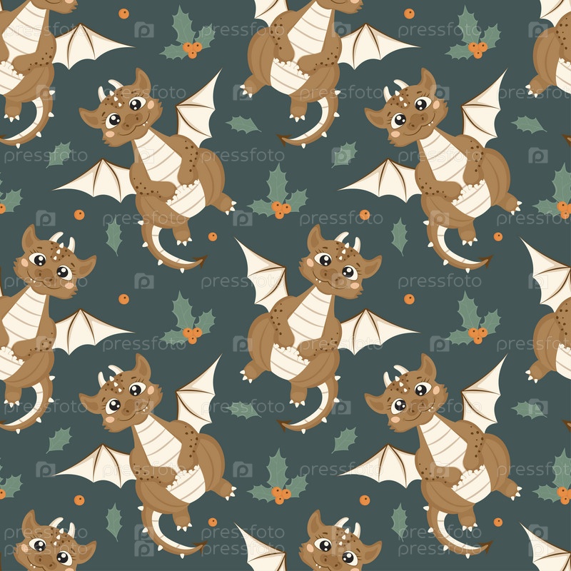 Бесшовный узор с милым улыбающимся драконом и листьями омелы в мультяшном стиле