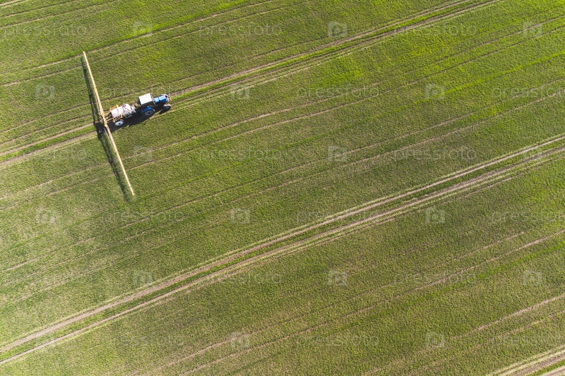 Вид с воздуха на вспашку и опрыскивание сельскохозяйственным трактором поля. Сельское хозяйство. Вид сверху. Фотография сделана с помощью дрона