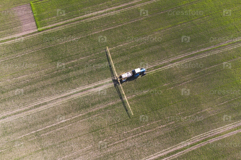 Вид с воздуха на вспашку и опрыскивание сельскохозяйственным трактором поля. Сельское хозяйство. Вид сверху. Фотография сделана с помощью дрона