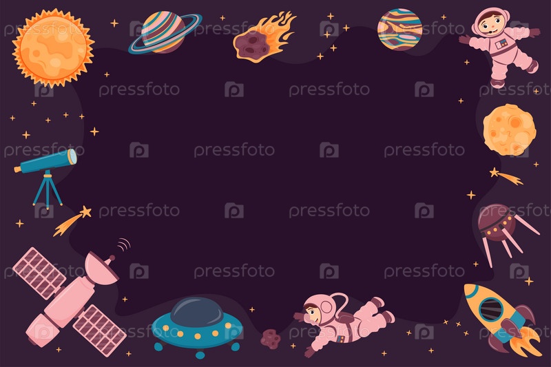 Векторный фон с астронавтами, планетами, космическими кораблями, ракетами, спутниками, метеоритами, космической станцией в мультяшном стиле