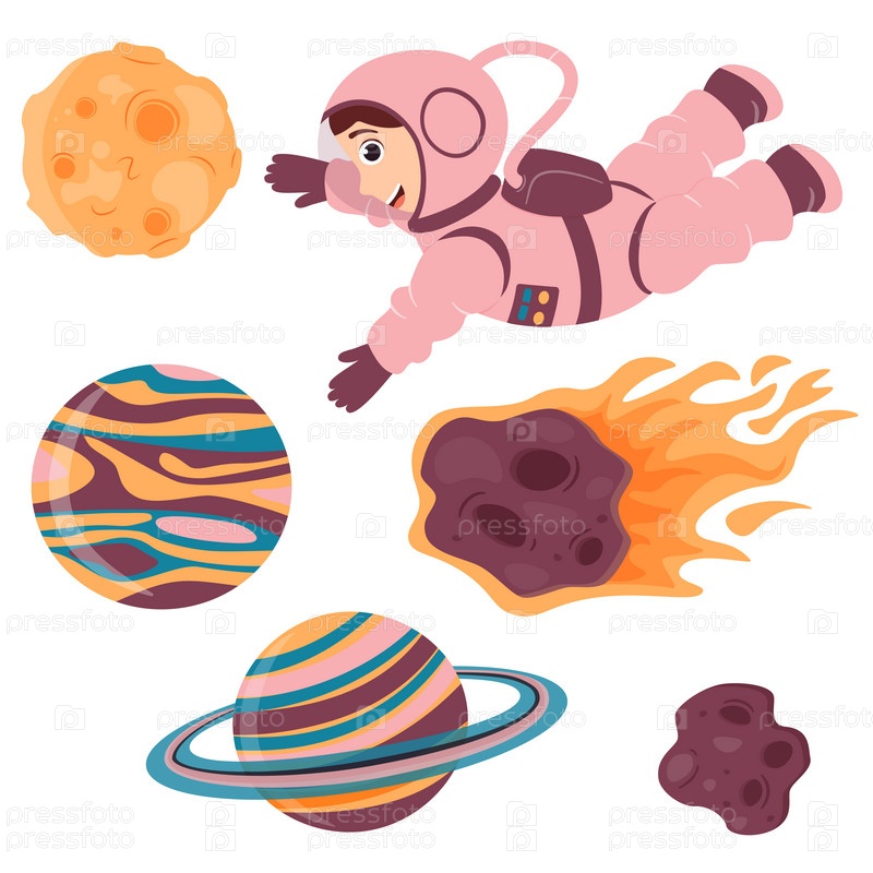 Набор иллюстраций с милым космонавтом, луной, метеоритом и планетами в мультяшном стиле