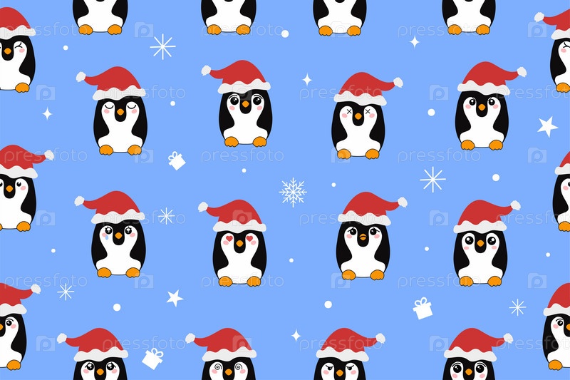 Рождественские милые маленькие пингвины в шапке Санты. Рождественский милый персонаж мультфильма о животных. Векторная иллюстрация