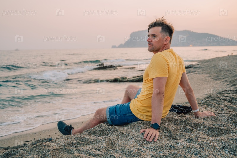 Мужчина сидит на пляже и смотрит на море в городе Алания