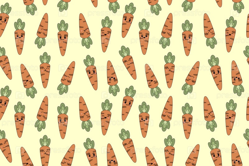 Векторный бесшовный рисунок моркови, нарисованной вручную, с лицом Каваи, изолированным на белом фоне. Векторная иллюстрация