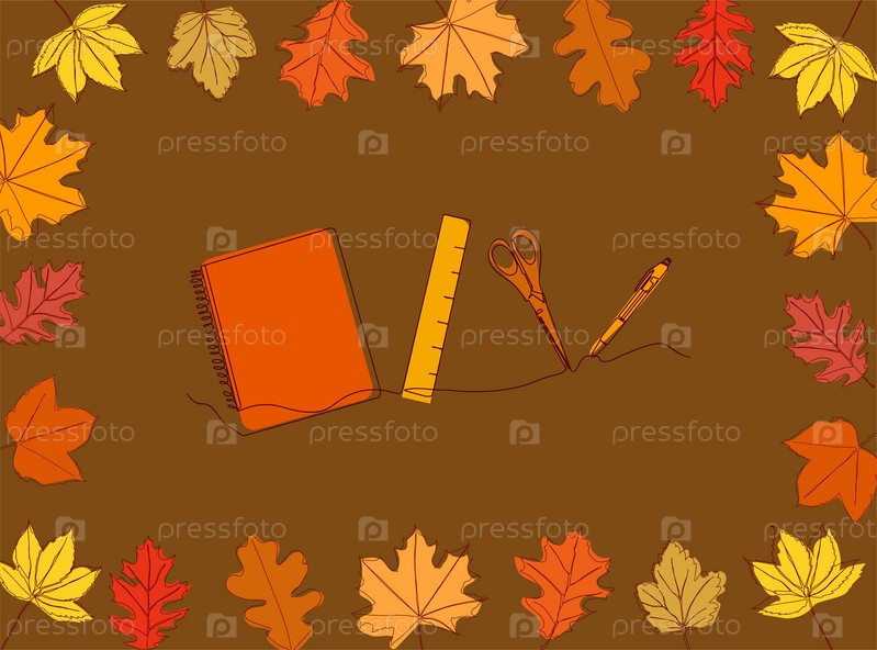 Школьные принадлежности нарисованы в одну линию на фоне осенних листьев. Обратно в школу. Векторная иллюстрация