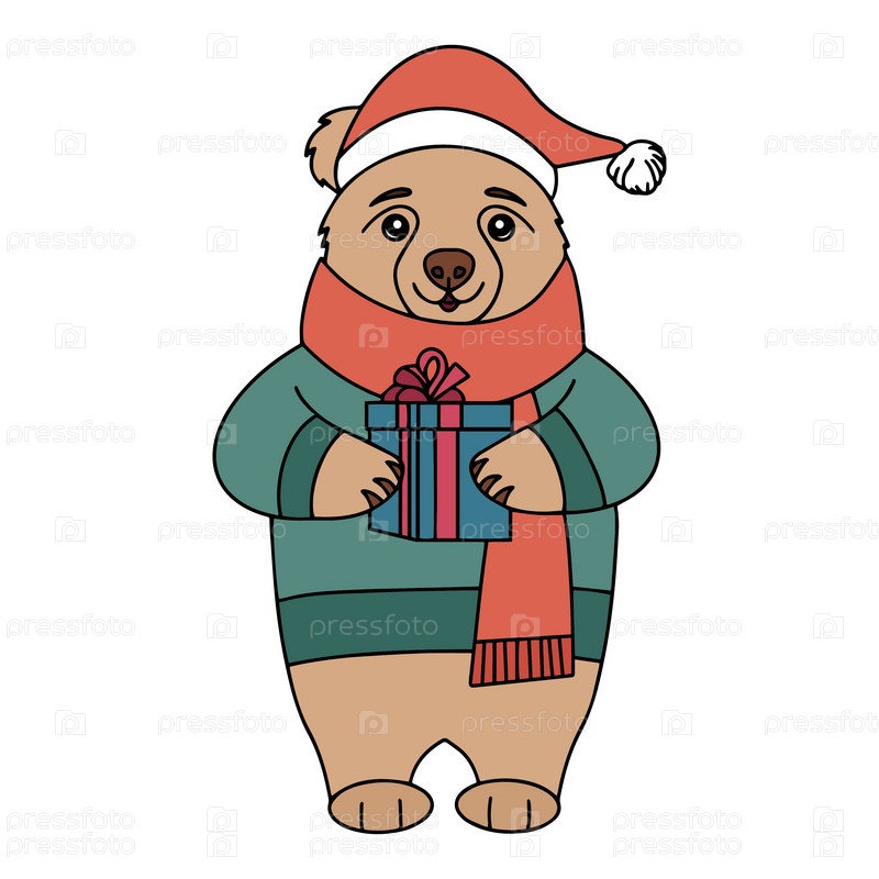 Векторная новогодняя открытка. Милый мишка в новогоднем свитере с подарком в лапках. Рождественская открытка