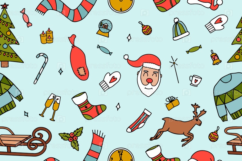 Рождественский бесшовный узор из каракулей. Бесконечная текстура для обоев, фона веб-страницы, оберточной бумаги