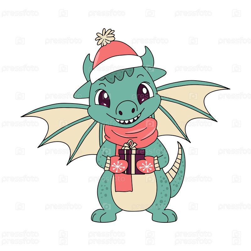 Милый мультяшный зеленый дракон в шапке Санты держит подарок. Новогодняя векторная иллюстрация животных на белом фоне. Векторная иллюстрация