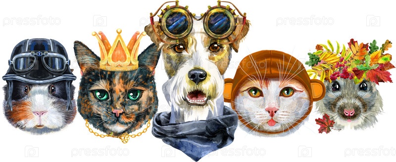 Граница с домашними животными. Ручная роспись акварелью, изолировать клип-арт на белом фоне. Дизайн баннера