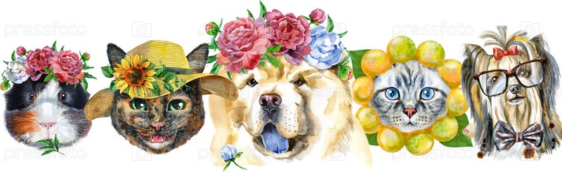 Граница из акварельных портретов собак, морских свинок и кошек