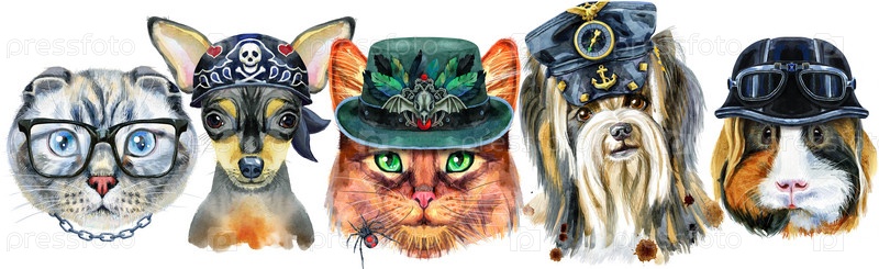 Граница из акварельных портретов собак, морских свинок, кошек и крыс