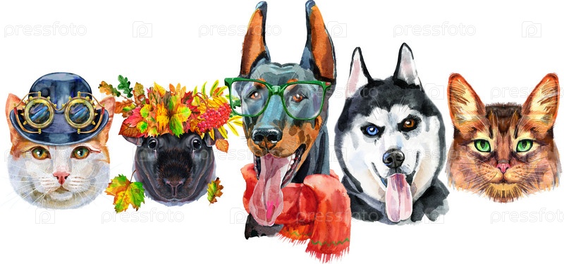 Граница с домашними животными. Ручная роспись акварелью, изолировать клип-арт на белом фоне. Дизайн баннера