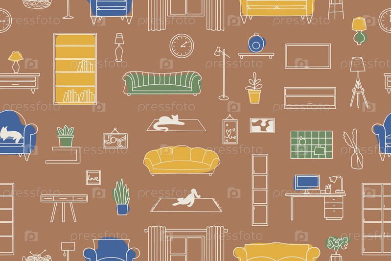 Бесшовный рисунок мебели, светильников, предметов интерьера. Современная векторная иллюстрация для баннера, веб-страницы, печатных СМИ. Вектор