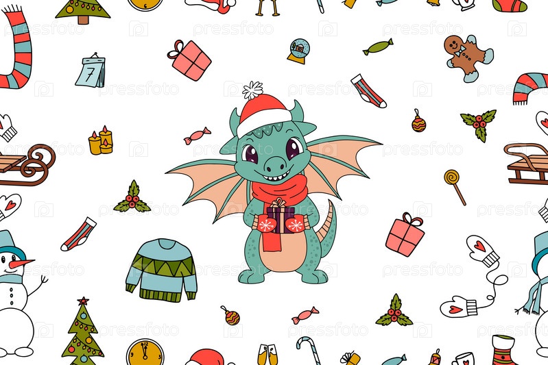 Бесшовный узор из новогодних элементов и милый символ дракона 2024 года. Векторная иллюстрация. Векторная иллюстрация