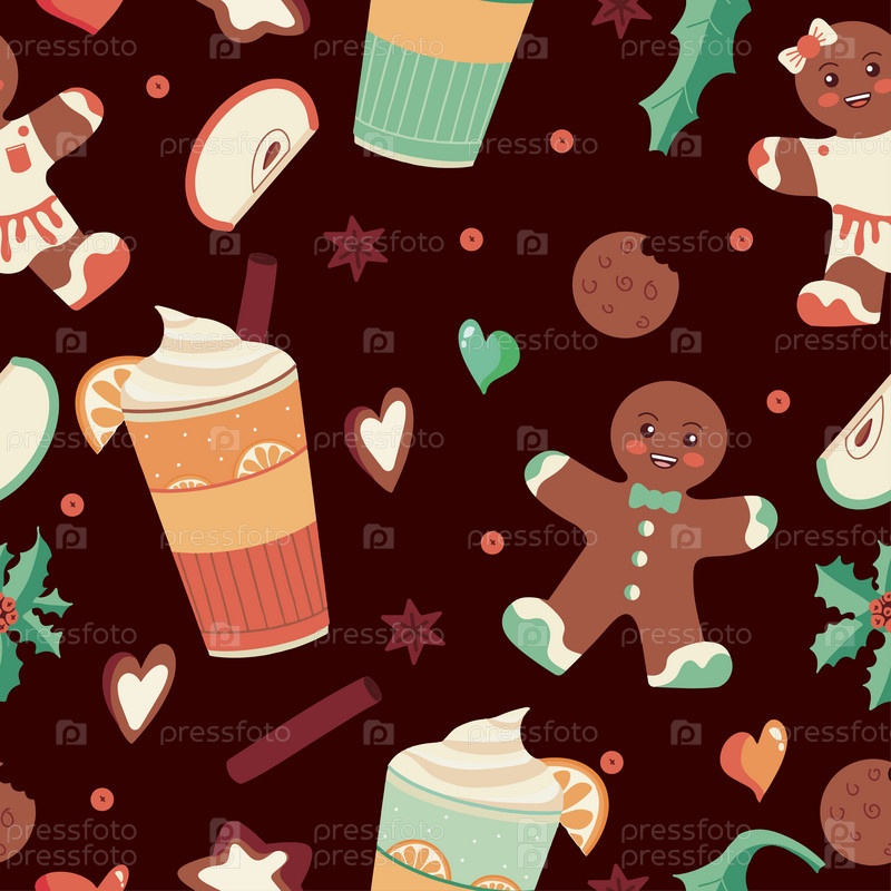 Бесшовный орнамент с зимними угощениями - пряниками, согревающими напитками, специями. Ручной рисунок рождественских и новогодних элементов для дизайнерской оберточной бумаги. Векторная иллюстрация
