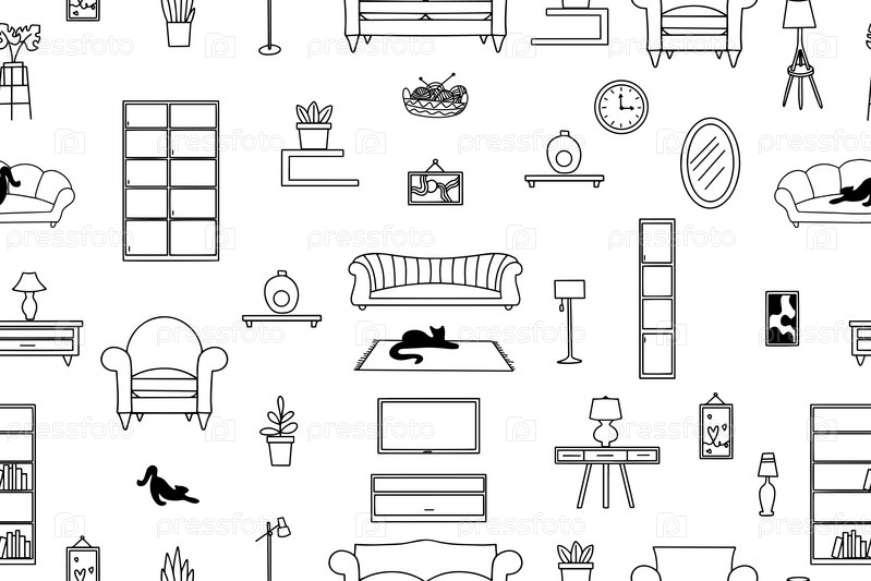 Мебель, светильники и растения для дома. Бесшовный узор. Современная векторная иллюстрация для баннера, веб-страницы, печатных СМИ