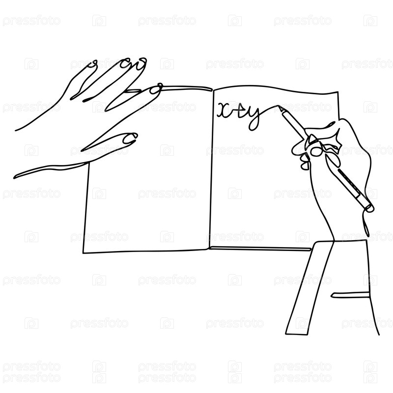 Мужчина пишет ручкой в пустой тетради. Крупный план почерка в блокноте. Одна линия векторной иллюстрации
