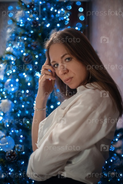 Удивительные моменты праздника: счастливая женщина позирует дома на фоне елки