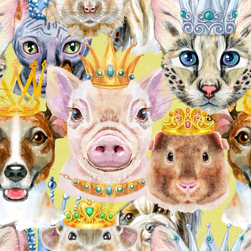 Бесшовный рисунок собаки, морской свинки, кошки, мини-свиньи и крысы. Иллюстрация акварельных домашних животных. Акварель рисованной иллюстрации