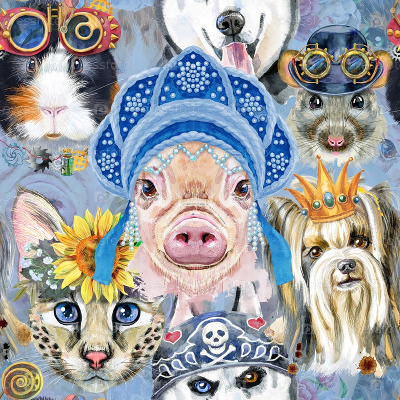 Бесшовный рисунок собаки, морской свинки, кошки, мини-свиньи и крысы. Иллюстрация акварельных домашних животных. Акварель рисованной иллюстрации